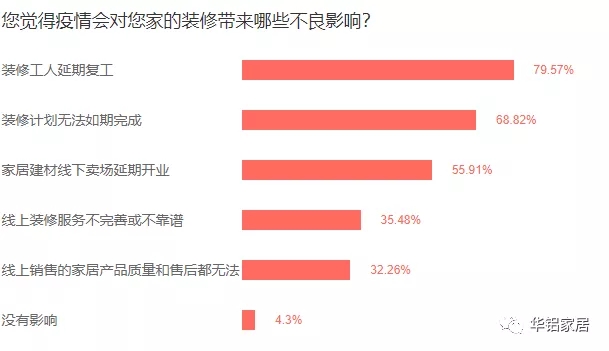 三、調查顯示,疫情過后,有近四成的家居用戶會考慮追加,裝修預算。63%的用戶表示經歷過疫情之后,會考慮加裝新風、空凈、凈水等改善家居環境的系統。51%的用戶打算選用更加環保的材質和家具。疫情目前對于裝修大的影響主要是裝修工人無法按時復工,從而導致裝修工期延長,另外線下賣場的延期開業也有一定的影響。