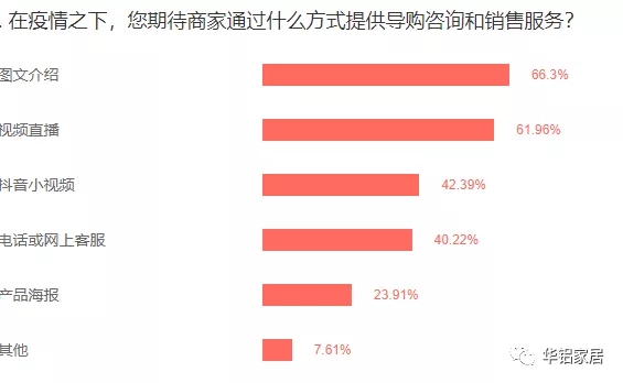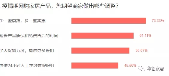 四、調查顯示,對于自己喜歡的家居品牌,大家一般會通過官方旗艦店和品牌官網來關注,其次官方微信和微博也是消費者獲取品牌信息的主要途徑。大家期待商家提供的線上導購和銷售服務,除了圖文介紹、電話客服等傳統方式之外,視頻直播和抖音視頻也頗受歡迎。由于受到疫情的影響,不少家居品牌的線下實體店無法正常營業,于是更加看重線上銷售的競爭,近期有不少品牌將推出各種在線銷售的各種優惠促銷活動,不過本次參與調查的消費者表示,希望商家少一些套路多一些實惠,同時需要延長產品質保和免費售后服務的時間。
