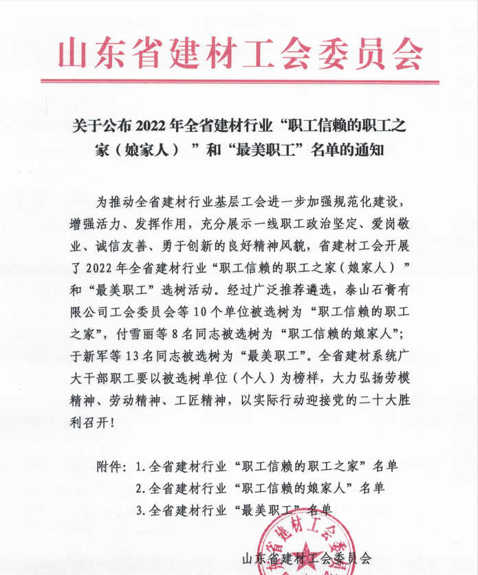 近日,山東省建材工會委員會發布《關于公布2022年全省建材行業“職工信賴的職工之家(娘家人)”和“最美職工”名單的通知》,山東華建鋁業集團有限公司工會委員會被選樹為“職工信賴的職工之家”。