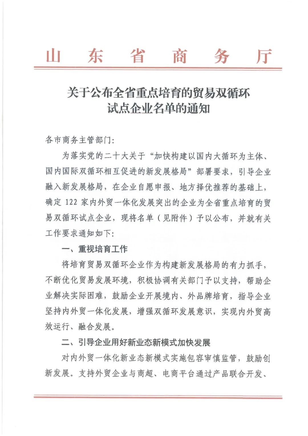 近日,山東省商務廳下發《關于公布全省重點培育的貿易雙循環試點企業名單的通知》,就確定的122家“貿易雙循環試點企業”進行對外發布,山東華建鋁業集團有限公司成功入圍。